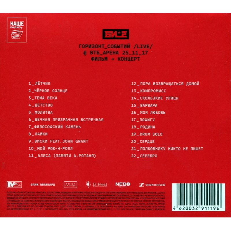 Концертный фильм Би-2 "Горизонт событий" LIVE. В издание вошла запись московской презентации альбома "Горизонт событий", которая состоялась в ноябре 2017 года на "ВТБ Арене".