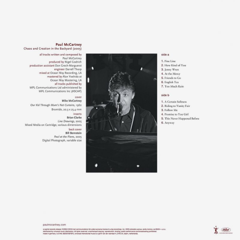 Chaos and Creation In The Backyard - переиздание на тяжелом виниле тринадцатого по счету сольного студийного альбома Пола Маккартни, выпущенного в 2005 году. Альбом, записывавшийся довольно долго был спродюсирован известным по сотрудничеству с Radiohead продюсером Найджелом Годричем при поддержке Джорджа Мартина.